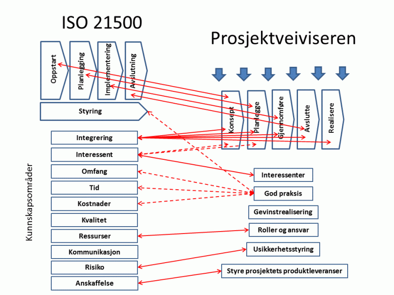 Prosjektveiviseren beskriver ikke alle temaer som prosjektleder/delprosjektleder trenger for planlegging og oppfølging av prosjektets gjennomføring. Kunnskap om disse må hentes fra andre kilder, for eksempel ISO 21500®. Hensikten med figuren nedenfor er å synliggjøre relasjonene mellom strukturen i ISO 21500 og Prosjektveiviseren. Stiplede piler antyder noe svakere knytninger enn de heltrukne pilene.
