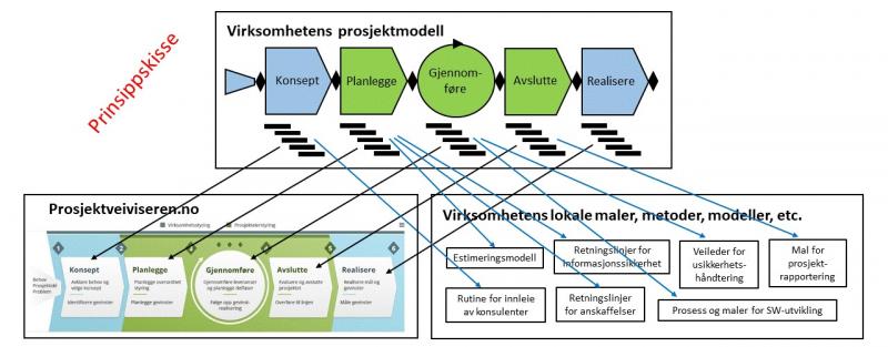 Virksomhetens prosjektmodell vil da fremstå som tilpasset til virksomhetens eget virkefelt og prosjektomgivelser, samtidig som vedlikeholdet i forbindelse med nye versjoner av Prosjektveiviseren blir relativt enkelt og oversiktlig.
